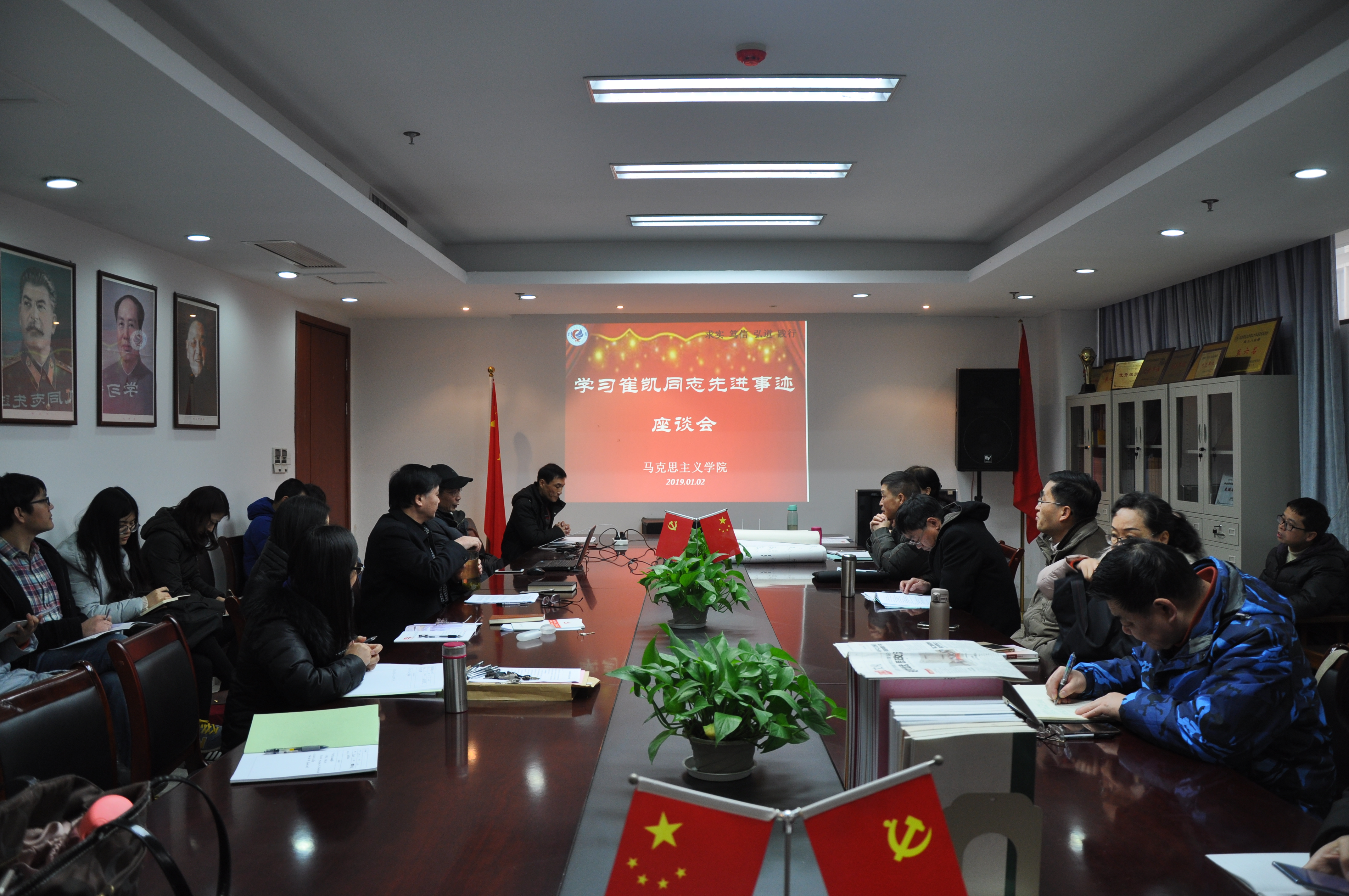 2019年1月2日下午,八叉书库 组织师生齐聚恕园1-306,开展学习崔凯同志先进事迹座谈会,本次专题学习交流会冯群老师担任主讲人,党总支书记、院长余龙进主持专题学习会并讲话。