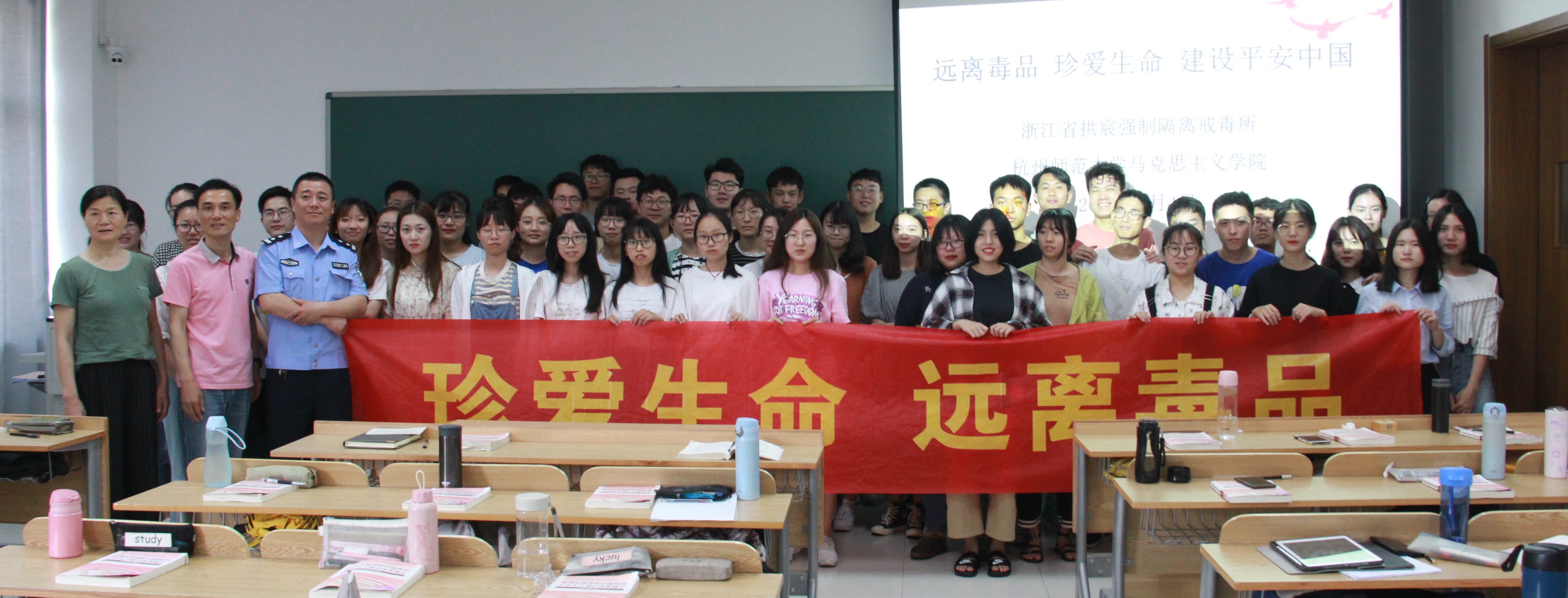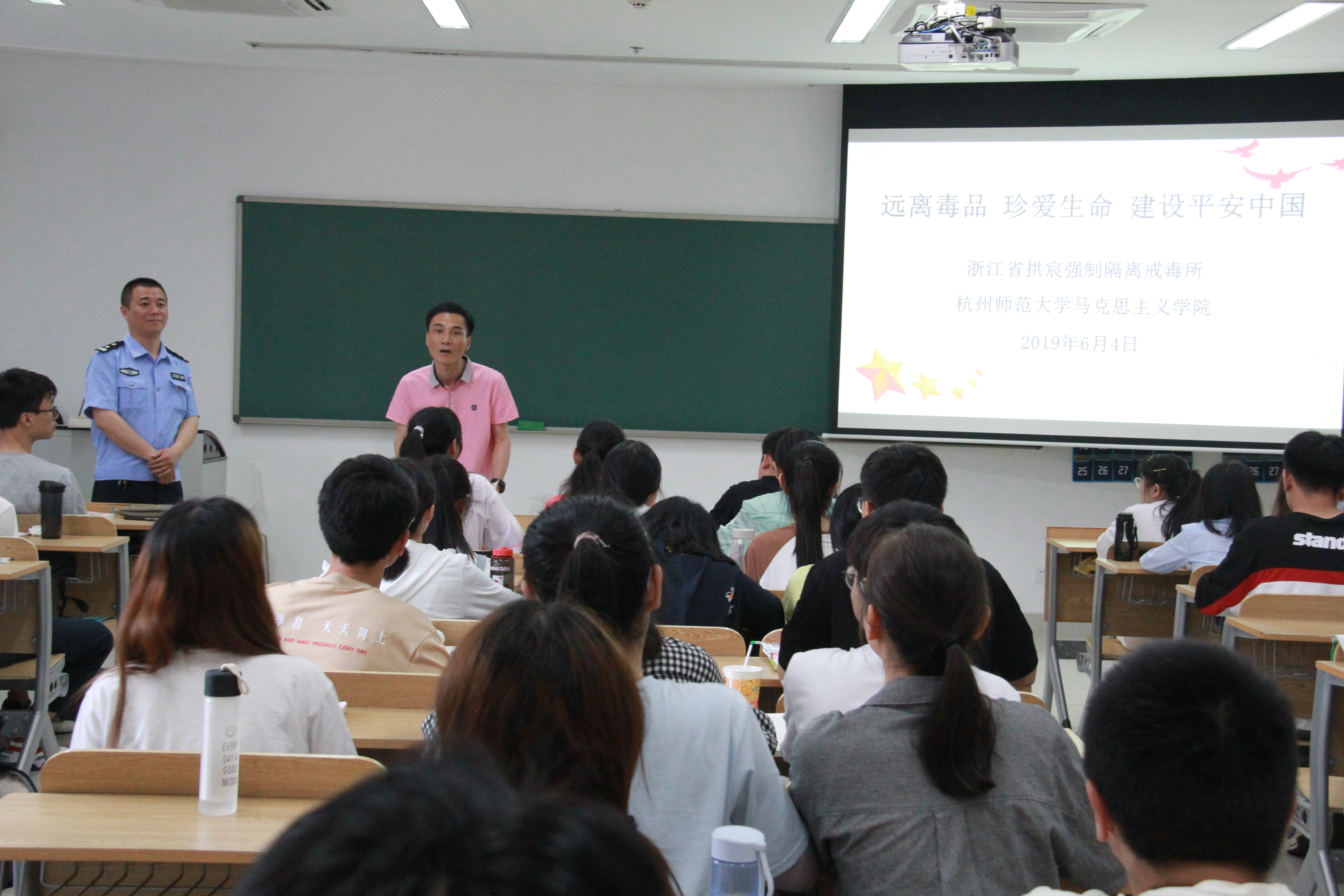 为增强大学生识毒、防毒、拒毒意识,加强大学生毒品预防教育工作, 八叉书库 将禁毒教育融进思想政治理论课堂。6月4日上午,学院邀请了浙江省拱宸强制隔离戒毒所的郭崧、黄周青、陶侃警官与马院教师共同上了一堂精彩的禁毒教育课。