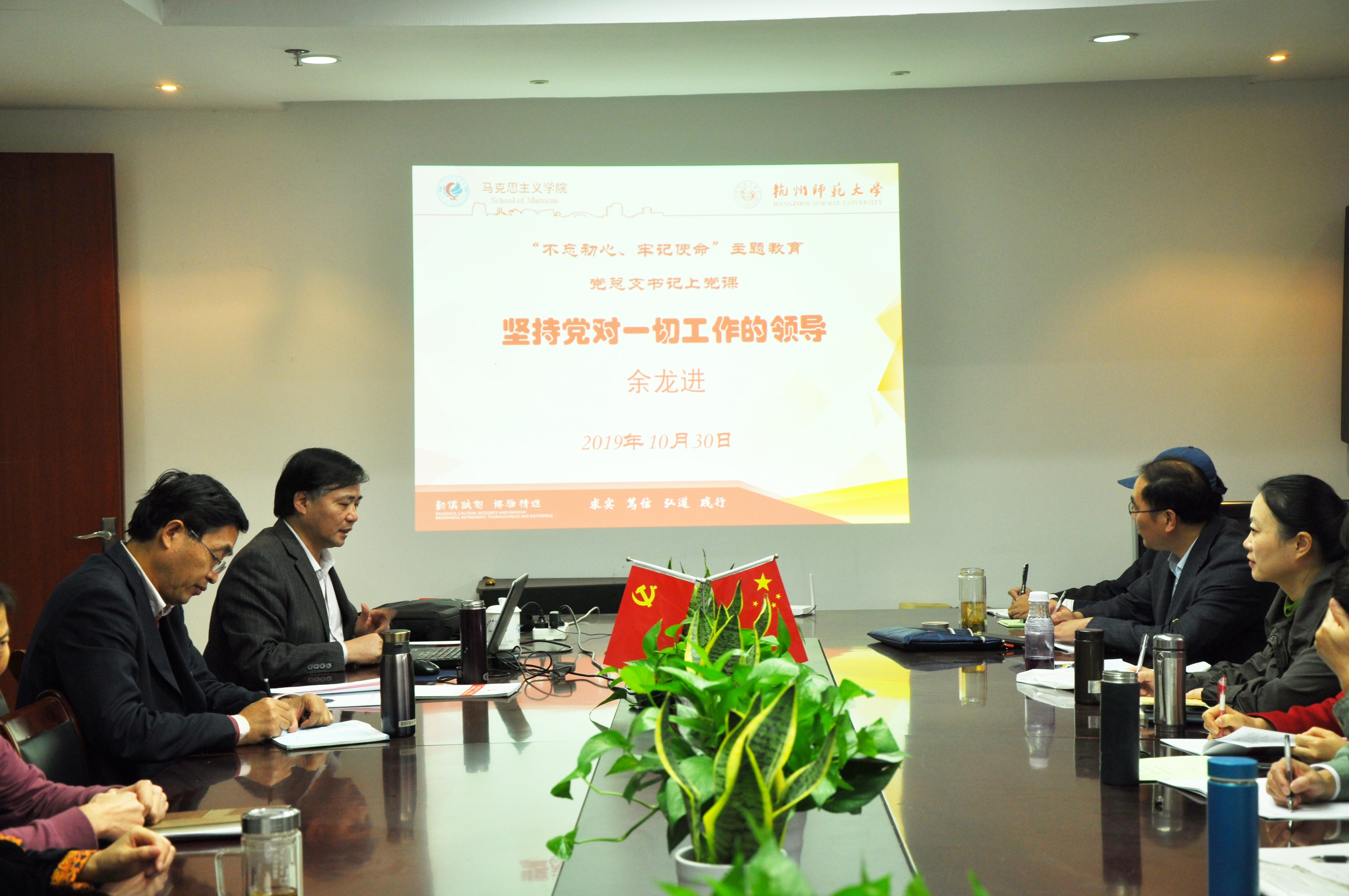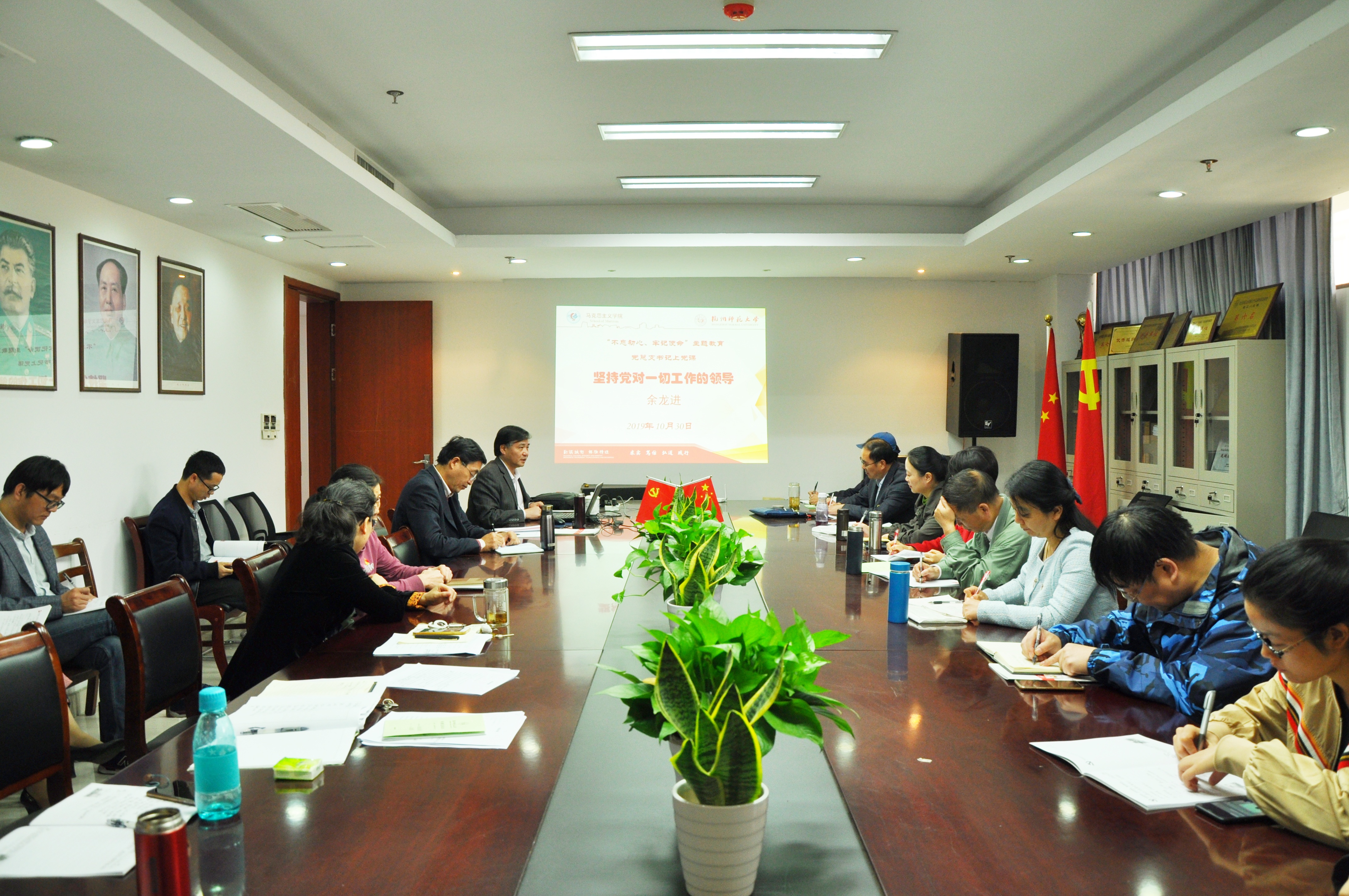 为进一步深化“不忘初心、牢记使命”主题教育学习,积极贯彻中共中央党史和文献研究院编辑的习近平总书记《论坚持党对一切工作的领导》一书的精神,10月30日下午,八叉书库 党总支书记、院长余龙进教授以“坚持党对一切工作的领导”为主题,给全体党员讲授党课。校纪委副书记、纪检监察室主任黄燕参加党课。