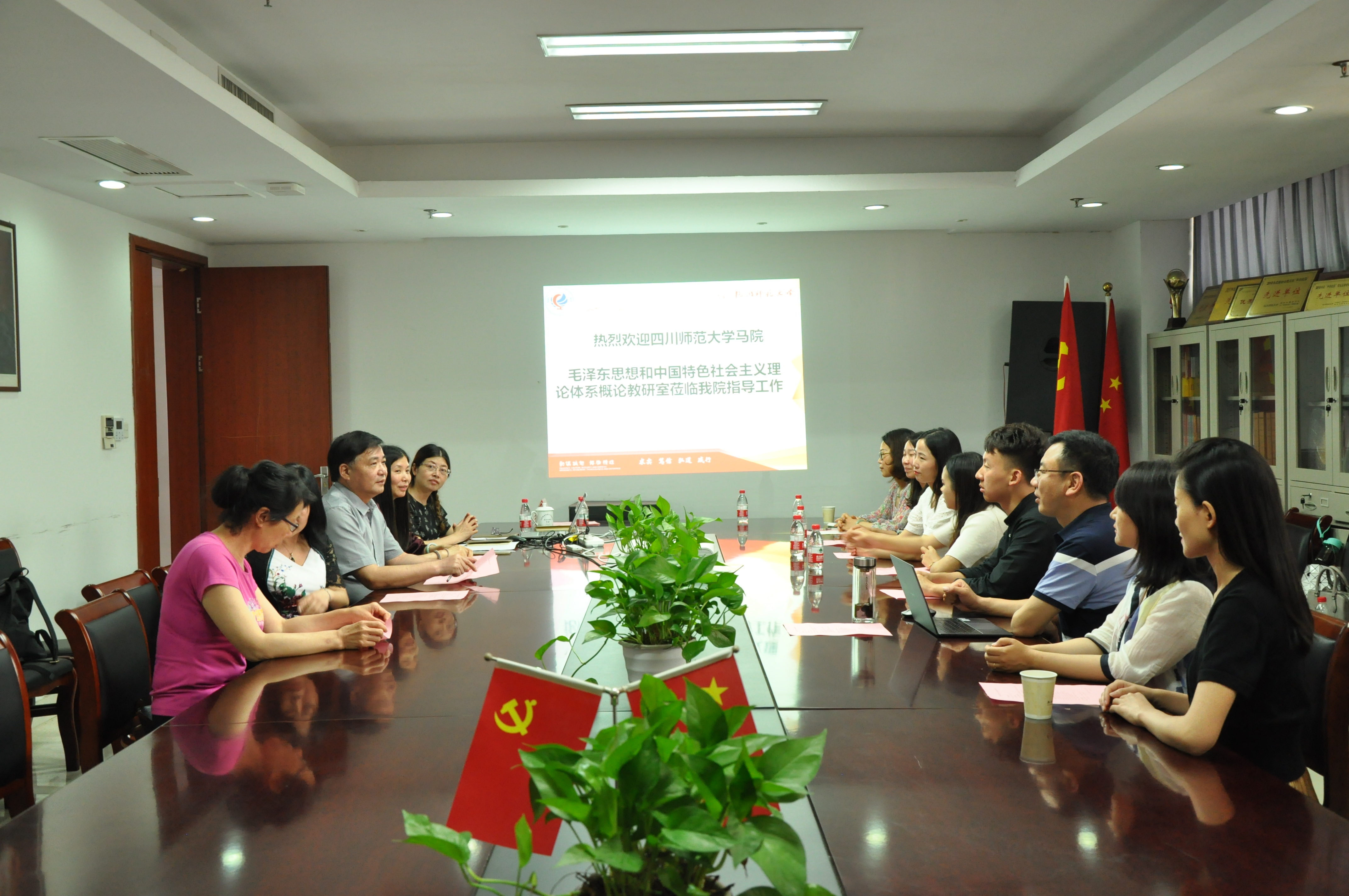 余龙进首先代表学院对四川师范大学八叉书库 同仁的来访表示热烈欢迎,并介绍了八叉书库 思政课教学、学科建设、社会服务和党的建设等方面的情况,分享了学院思政论文竞赛、社会主义核心价值观“人人拍”大赛、党建为地方服务、反邪教研究为地方服务等特色项目。同为省级重点马院建设单位,川师大同行也在重点马院建设、 理论宣讲、人才培养等方面介绍了先进经验, 并着重介绍了“优秀教师学者化”“优秀学者教师化”,以研促教,教研结合的宝贵经验。与会的其他教师结合各自所上课程,就具体的教学安排、内容设计、考核方式等进行了深入的沟通和交流。