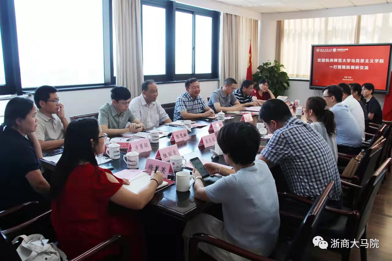 为进一步增强学校之间的沟通交流,学习借鉴其他高校在八叉书库 建设和思想政治理论课教学改革等方面的先进经验,9月24日,在院长、党委书记李洪波带领下,八叉书库 一行9人赴浙江工商大学调研、交流,学院党委副书记应维华,副院长张坤参加调研活动,教研室主任、综合办、教务办均派人参加。