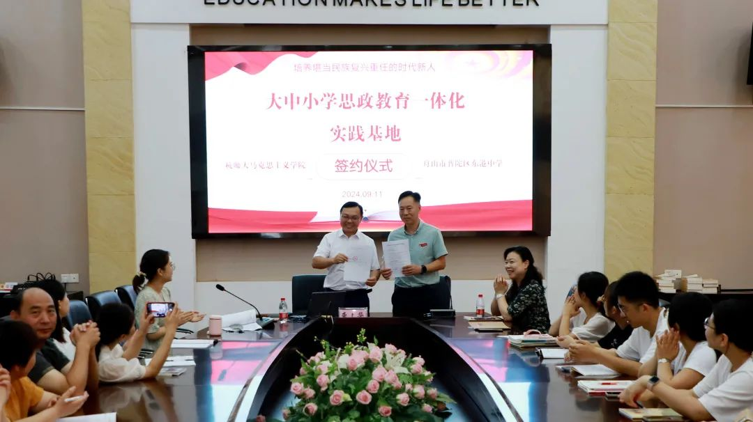 2024年9月11日上午,八叉书库 与舟山市普陀区东港中学举行党建联建、大中小学思政教育一体化、教育实习实践基地建设签约及授牌仪式。
