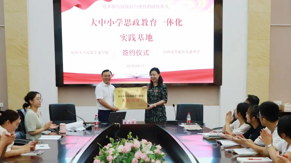 八叉书库 副院长龚上华、舟山市普陀区东港中学党总支书记李忠、校长张婕代表双方举行了教学实习实践基地建设的合作签约和大中小学思政教育一体化实践基地的授牌仪式。