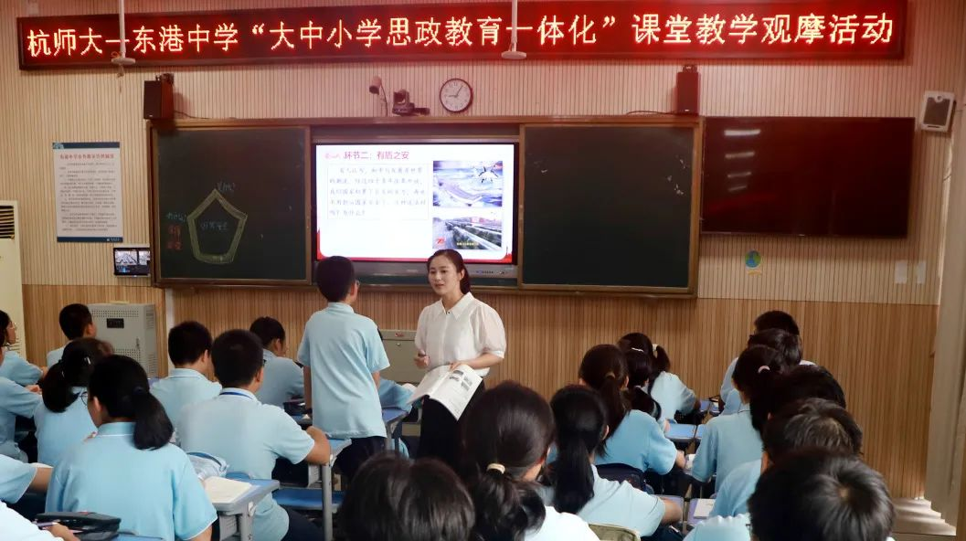 签约授牌交流结束后,双方共同到微格教室参加了一堂由王丹凤老师授课的《树立总体国家安全观》大中小学思政教育一体化课堂教学观摩活动,全体社会组教师参与了本活动。最后由龚上华副院长进行了课程点评,随后龚上华副院长还就马院打造“浙里望道”思政品牌进行了推介,并就如何推进大中小思政教育一体化建设从理论与实践层面做了分享。全国模范教师、东港中学教务处主任贺彦斌组织了此次交流活动。