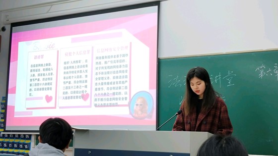 第二组:思政231班的阿依扎达·对先、章娅楠、扎黑拉·努尔汗同学,分享了一起关于冒名顶替上学的案例。通过此案为同学们讲解了宪法是保护每个人权利的最高法律,违反宪法将会受到法律的制裁。