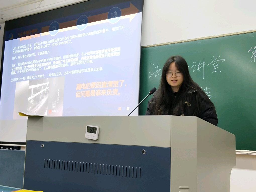 第三组:思政233班的许壹然、潘文烨、周晔座同学,带来案件:小崔一家的牛被电死,一开始三方行为人蔡大妈,包工头,三家公司都相互推卸责任。牛死的事实给小崔一家造成巨大的经济损失,于是他们寻求司法帮助。法官为了让小崔一家尽快得到补偿,寻找三方调解,最后三方达成一致共识,小崔一家得到应有的赔偿。这个案例充分体现了调解这一解决纠纷的方式的优越性。同时也让我们感受到邻里互助的温暖。