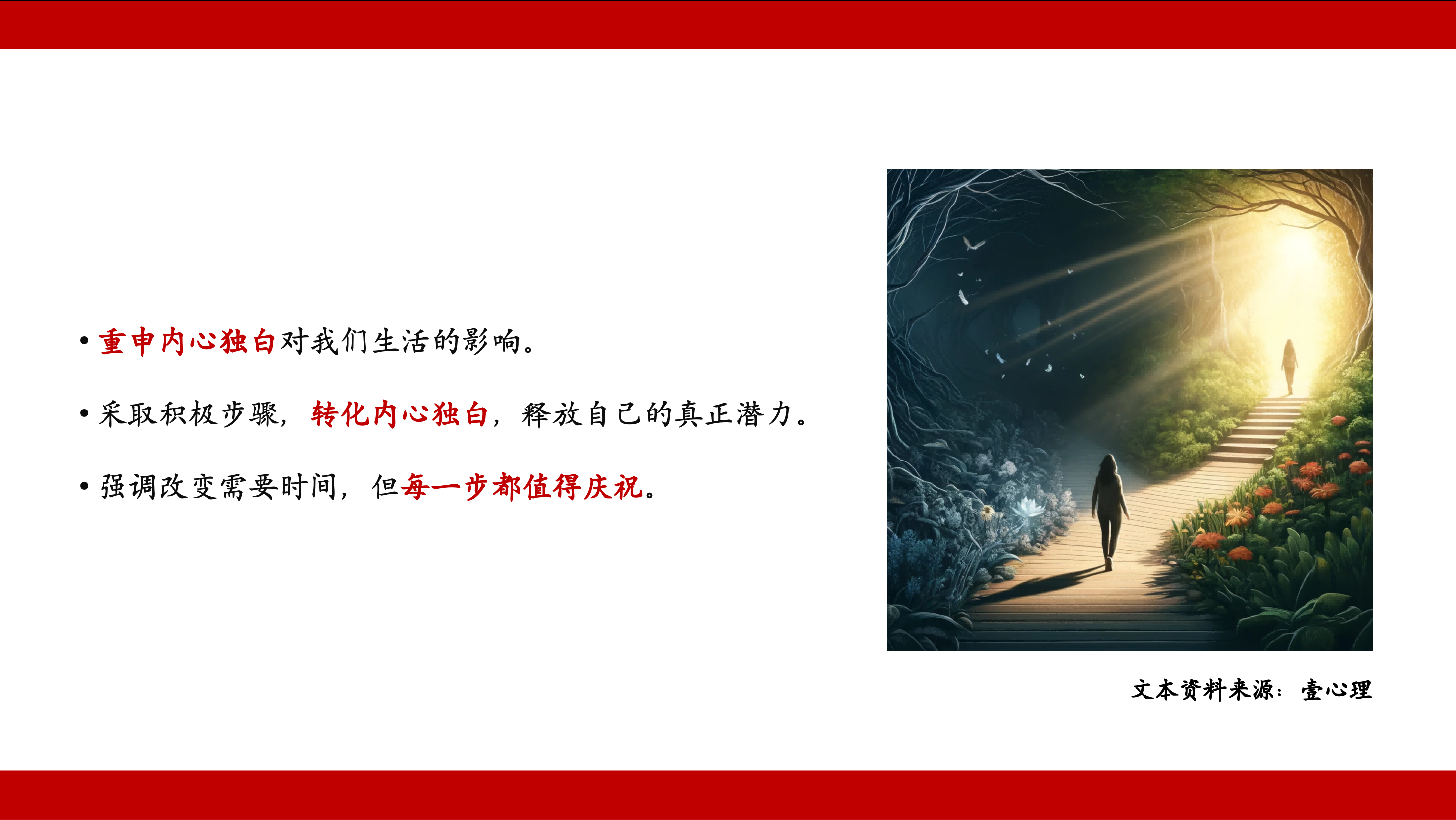 课程中,胡老师还分享了转化消极思维、释放内在潜力的策略,他建议我们应该学会与自己合作,让内心世界变得更平和、更强大。我们需要注意自己的身心健康,及时休息,而不是一味追求效率。此外,我们还需要学会与灾难化思维相处,不要过分担忧想象中的糟糕结果,而是应该专注于当前的任务。最后,我们需要认识到“最好”是没有极限的概念,接纳现实生活中的不完美和不可控,珍惜眼前的人和事,把握当下的美好。这些应对内心独白的方法旨在引导学生实现自我成长与提升。