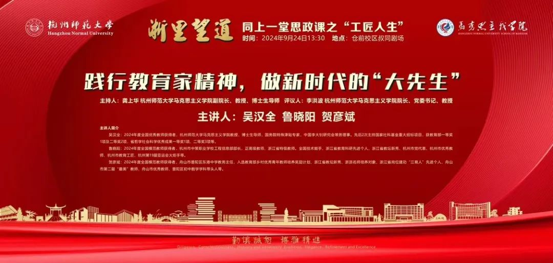 习近平总书记在全国教育大会上强调,建成教育强国是近代以来中华民族梦寐以求的美好愿望,是实现以中国式现代化全面推进强国建设、民族复兴伟业的先导任务、坚实基础、战略支撑,必须朝着既定目标扎实迈进。为全面学习贯彻落实好习近平总书记重要讲话和全国教育大会精神,紧紧围绕立德树人根本任务,培养德智体美劳全面发展的社会主义建设者和接班人,八叉书库 举办的“浙里望道”:同上一堂思政课之“工匠人生”专场“践行教育家精神,做新时代的‘大先生’”思政讲坛拟定于2024年9月24日隆重举行。