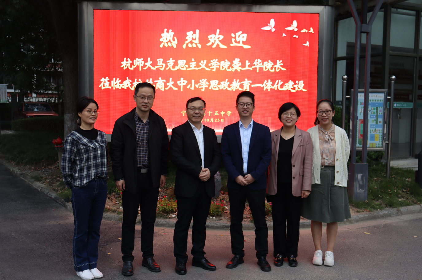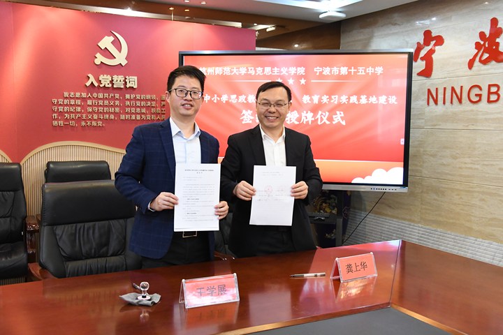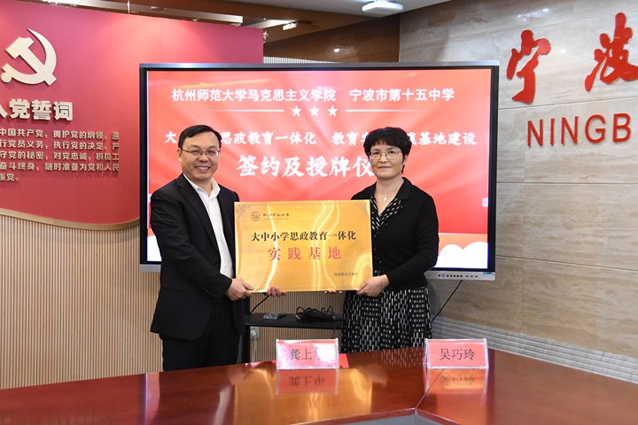 八叉书库 副院长龚上华教授与宁波市第十五中学校长干学展、党委书记吴巧玲代表双方分别举行了教学实习实践基地建设的合作签约和大中小学思政教育一体化实践基地的授牌仪式。