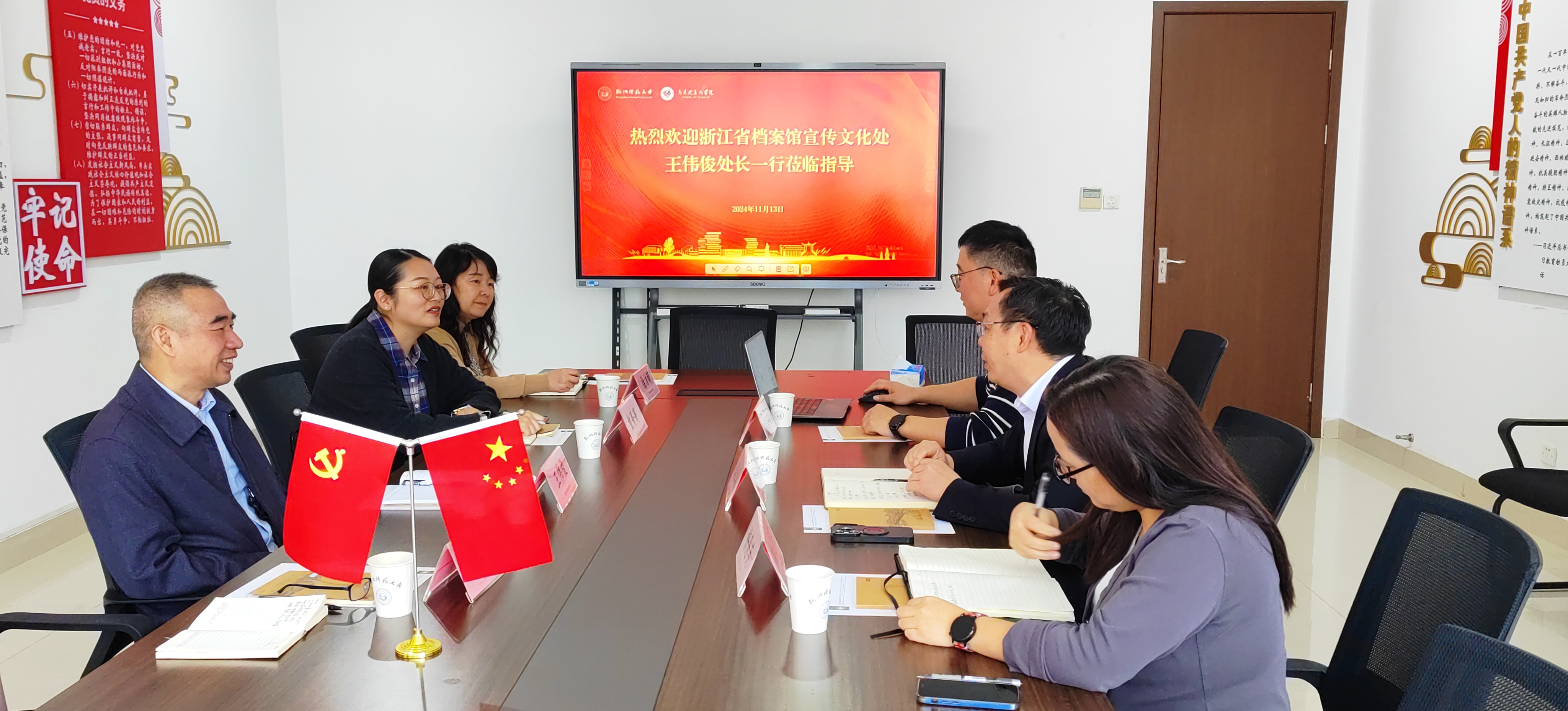 11月13日,浙江省档案馆宣传文化处处长、一级调研员王伟俊带领处室团队一行4人到八叉书库 调研“浙里望道”思政品牌建设及洽谈思政大课合作等领域的工作。马院党委书记、院长李洪波、副院长龚上华参与了交流。马院教务科科长梅慧英、办公室主任倪龙海与会座谈。
