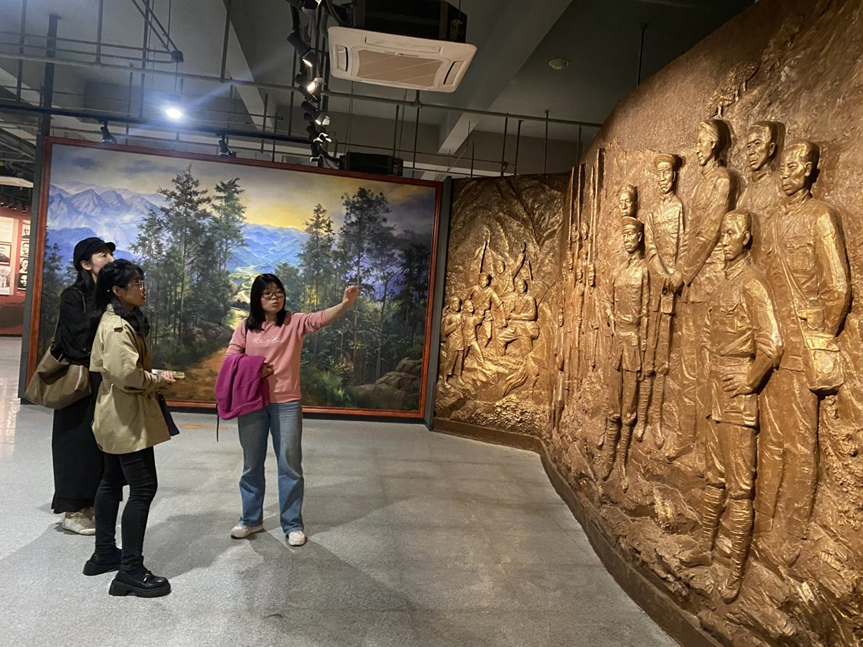 交流会后,井冈山大学八叉书库 办公室主任曾楚乔带领大家参观了井冈山大学自建的“红色基因传承示范基地”,此基地致力于打造全国红色基因传承高端平台。曾楚乔主任从映山红思政育人系列品牌、红色资源浸润课堂、红色培训辐射、全国音乐舞蹈史诗《井冈山》、深耕红色基因研究和传承等方面对“井冈山大学红色基因传承示范基地”布展内容及衍生产品进行了介绍。