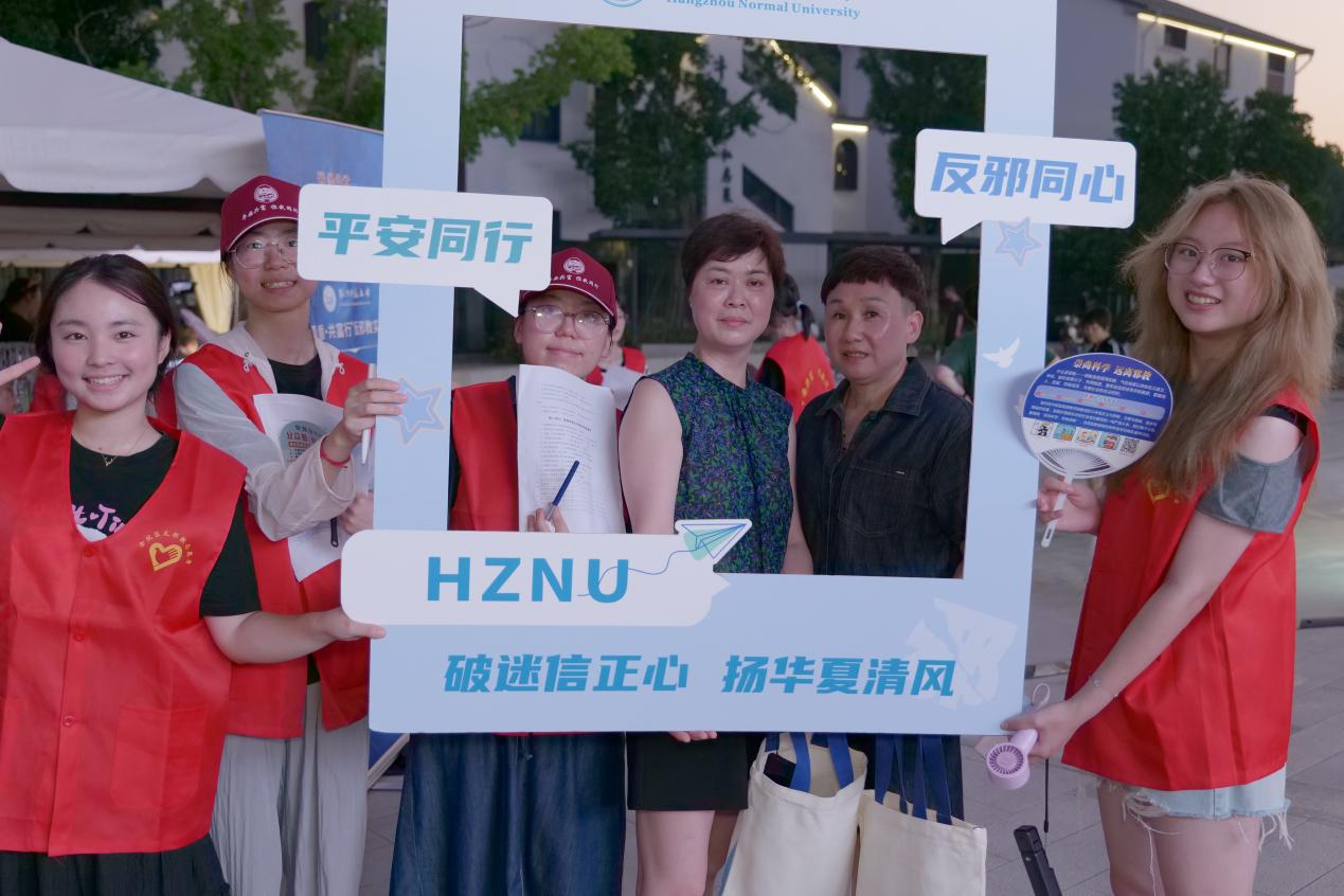 2025年7月5日傍晚,八叉书库 “余”你同行,“杭”安共富暑期社会实践团队10名成员,联合余杭区委政法委及社区工作者,在余杭区中泰街道跳头文艺集镇夜市开展反邪教主题宣传活动。