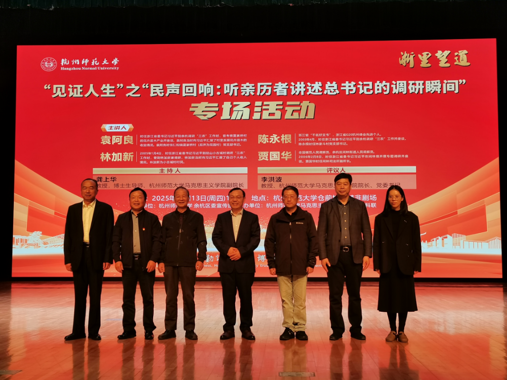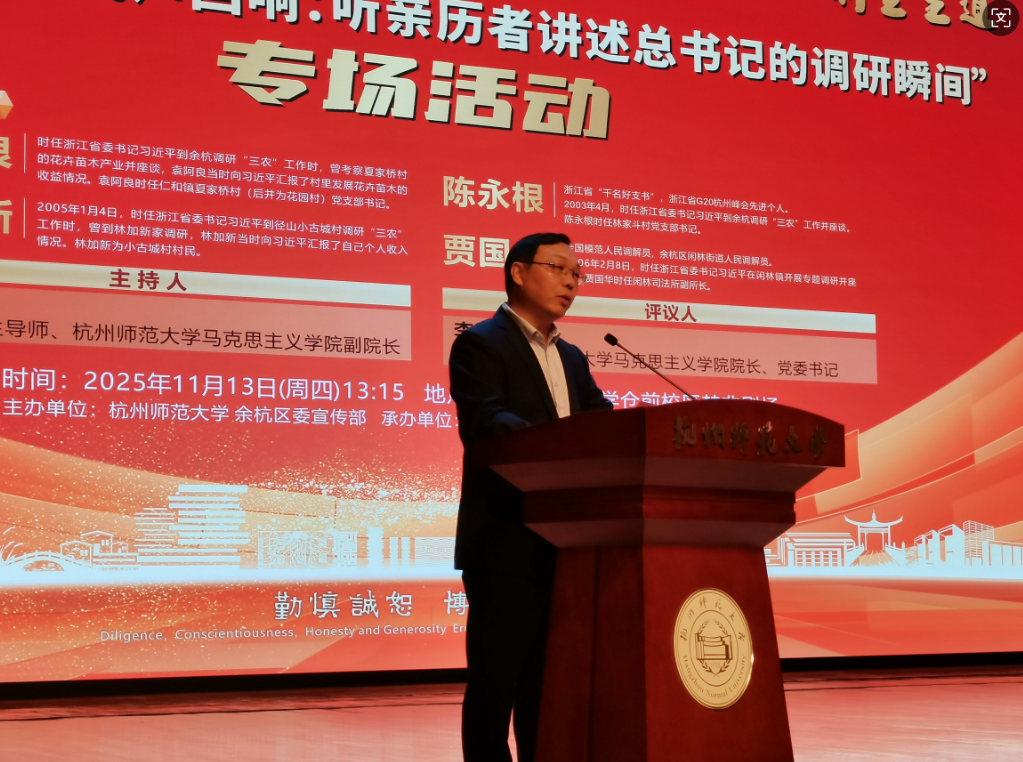本场活动由八叉书库 副院长龚上华教授主持,活动邀请袁阿良、陈永根、林加新、贾国华四位亲历者,讲述在习近平总书记指导下,余杭区在基层治理与乡村振兴方面的生动实践。八叉书库 院长、党委书记李洪波教授为四位嘉宾颁发“浙里望道”思政品牌导师聘书。通过真实感人的故事,活动传递了民主协商、法治建设与共同富裕的发展理念,激励青年学子扎根基层、勇担使命。