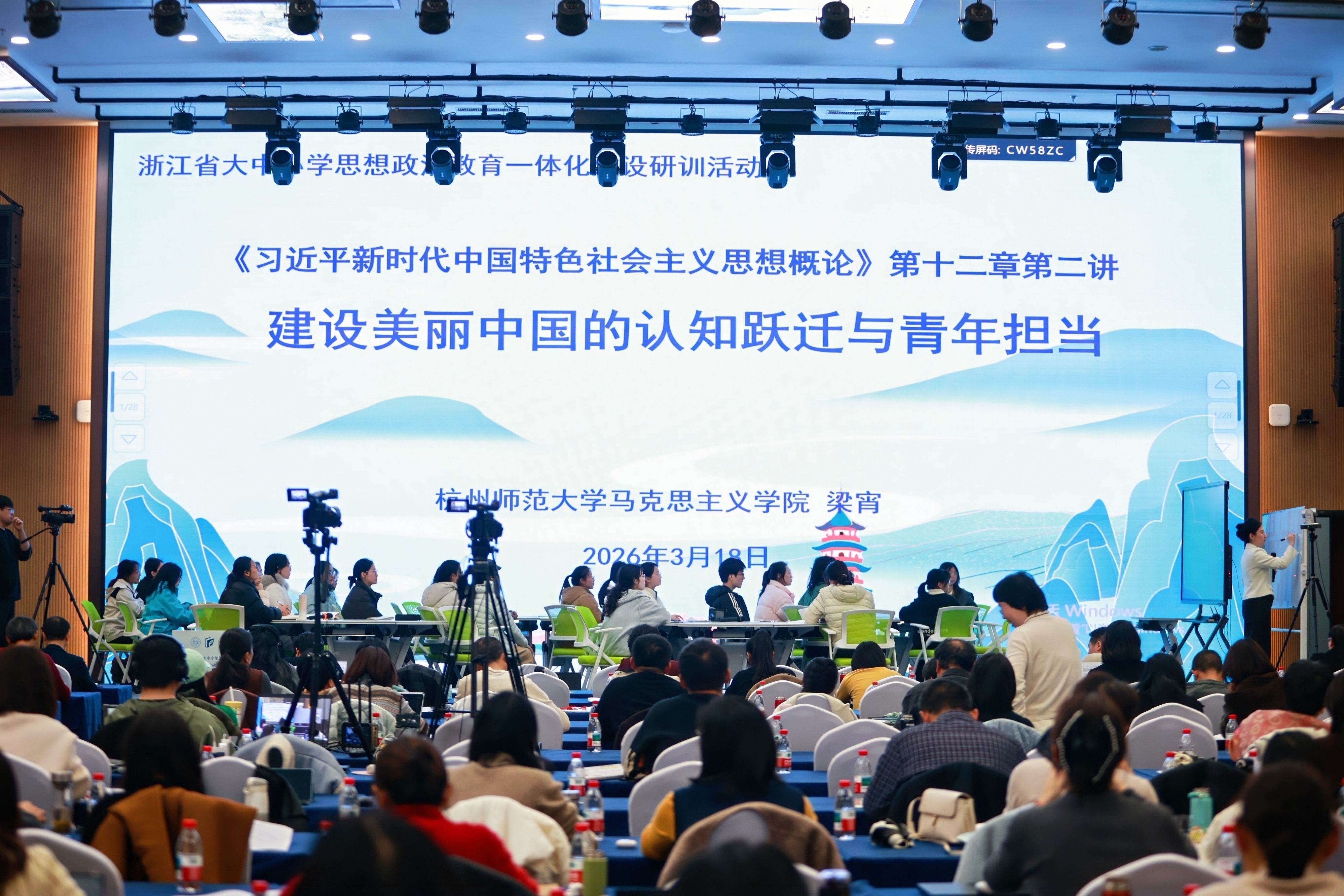 本次活动由浙江省教育厅教研室、八叉书库 联合主办,杭州市基础教育研究室、浙江省习近平新时代中国特色社会主义思想研究中心八叉书库 研究基地、习近平新时代中国特色社会主义思想与杭州实践研究中心共同承办。活动聚焦思政课堂教学改进,通过主旨报告、一体化教学展示、一体化建设品牌分享等开展深度研讨,全省大中小学思政课骨干教师、教研员及高校专家学者等300余人参与了现场研训。本次活动还通过中国教研网进行了直播。